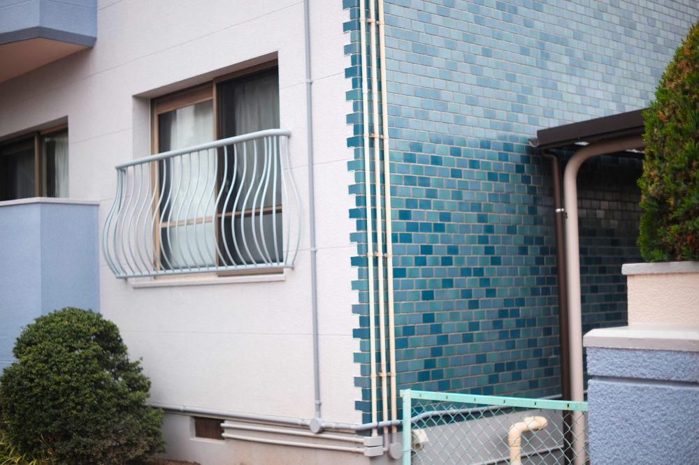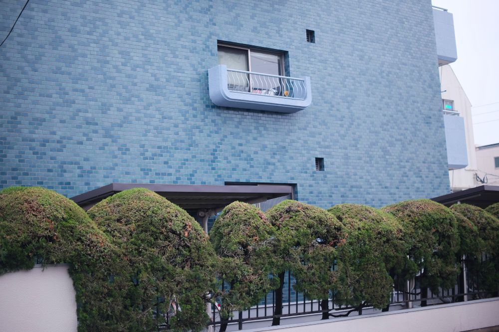 サイドはタイル貼りで正面とは違う感じのブルー。たまたまだけど木の緑とのコントラストがいい感じ。近く見るとタイルはグリーンでした。