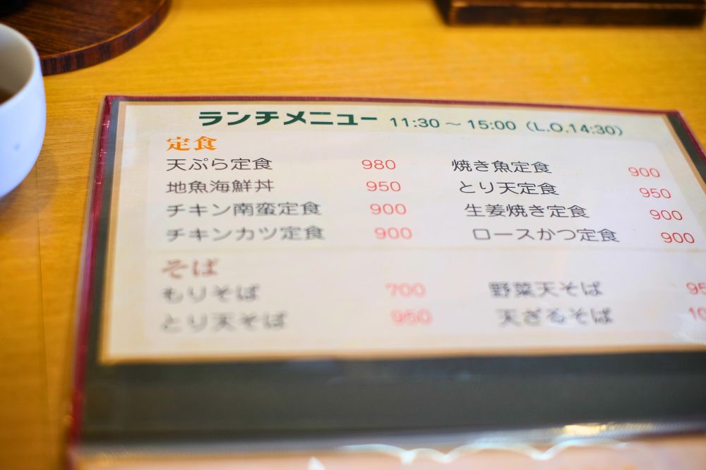 ランチメニューたくさんありますね。反射で全然見えないけどたくさんあるのは分かる。蕎麦もいいけど、今日は定食の気分かな〜。まだ決めずに入ります。