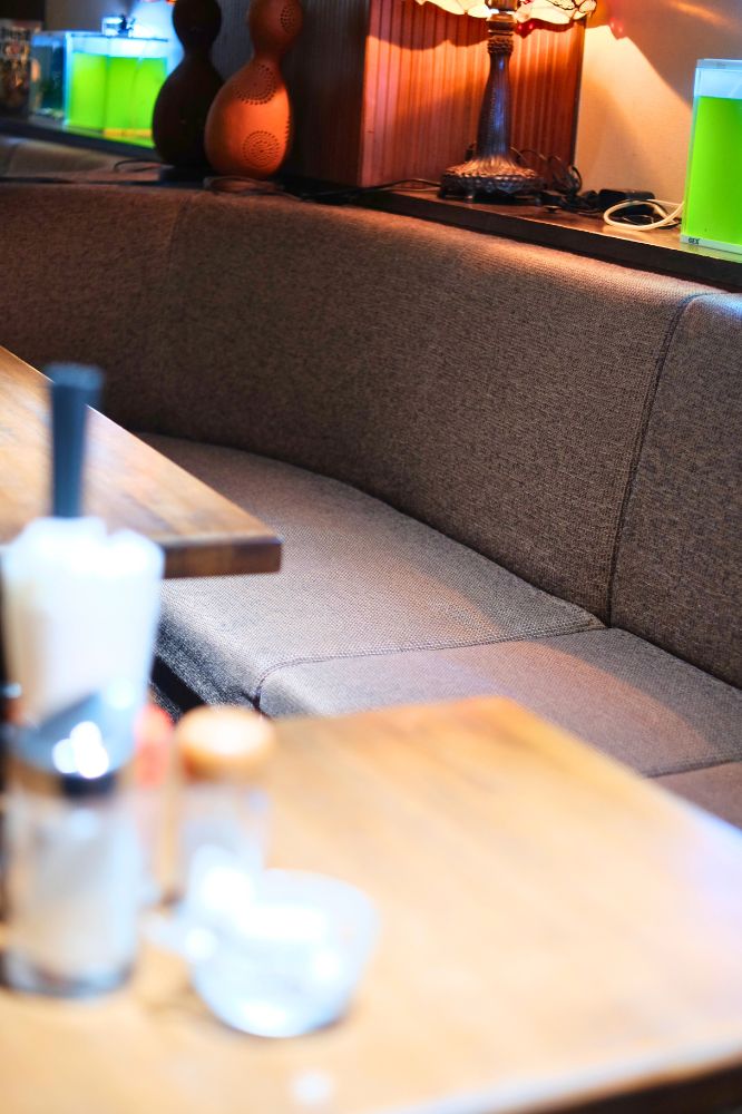 ソファが全部一続き!こんな長いソファあるだ。店内には昔から使われてるであろうものがたくさん。好きな感じです。