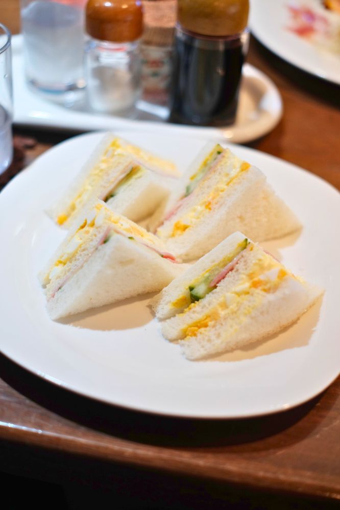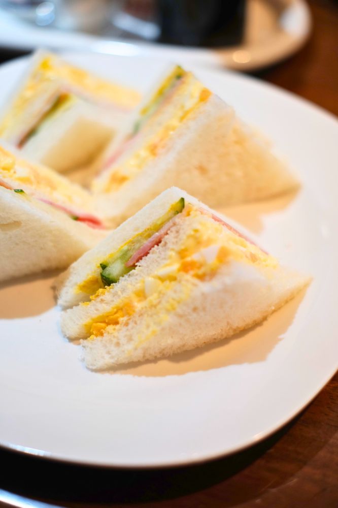 注文したサンドイッチがきた!うまい!具は玉子サラダやキュウリでシンプルなんだけど、程よい酸味があって好きな味です。同じやつもう一皿食べたかった。
