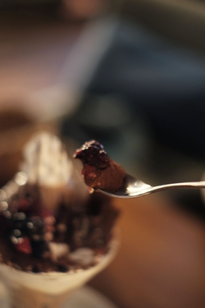 ベリーが入ってる。チョコや生クリームの中にたまにくる酸味がいいですね。