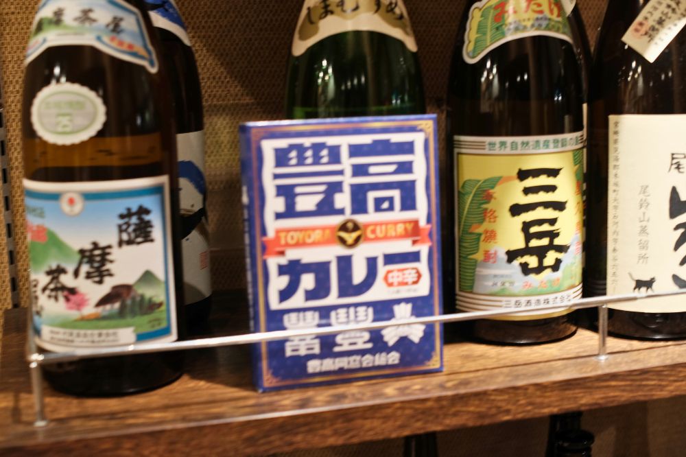 焼酎の棚にカレーを発見。どこかの高校?が作ってるみたい。店主さんの高校なのか?