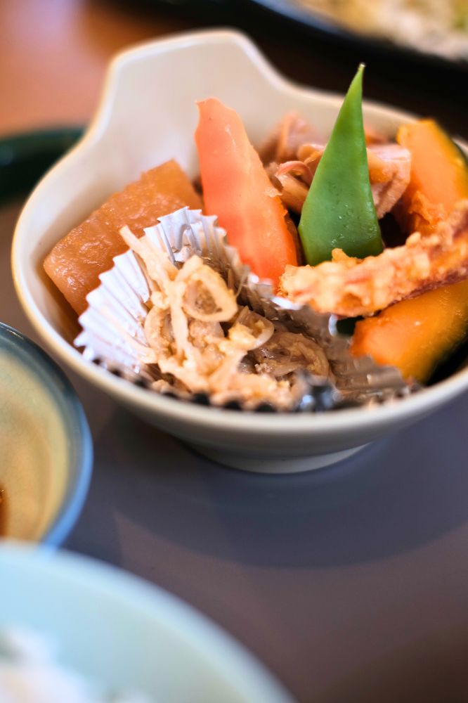 小鉢もすごいボリューム!煮物、エノキの卵炒め、さつまいもの天ぷらなど。さらに冷奴までついてる。これで650円。信じられない。