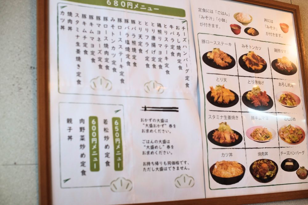 メニューがどれもおいしそう!めっちゃ迷ったけど店名を冠した「若松炒め定食」にします。妻はから揚げ定食をチョイス。食券買ってお店の人に渡すスタイルです。