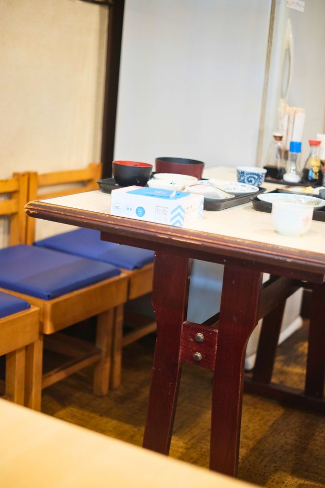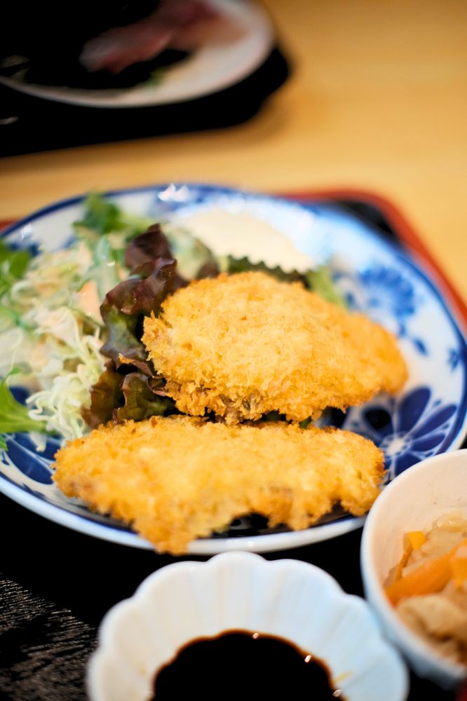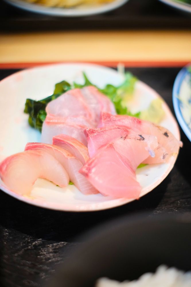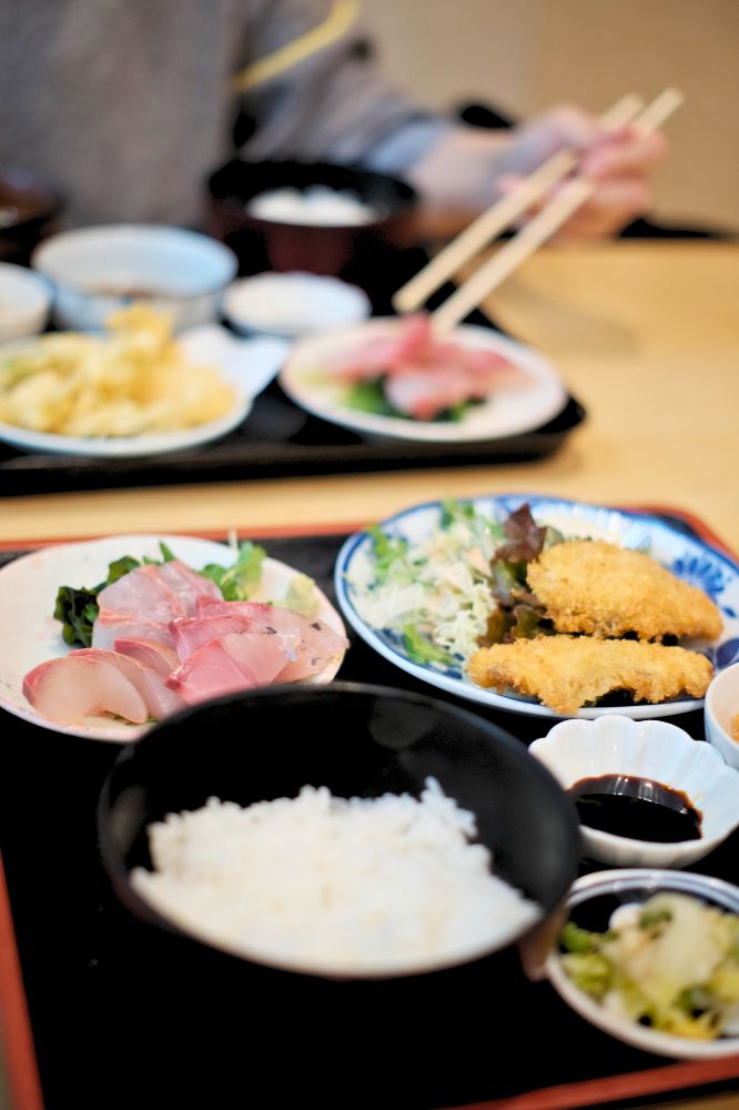 支払いは現金のみ。こちら40年ほどやっているお店とのこと!すごい。外に置いてあったメニューから、刺身定食に決めました。刺身の他におかずを、鶏天、イカフライ、塩サバ、アジフライの4種類から選べます。僕はアジフライ、友達は鶏天にしました。