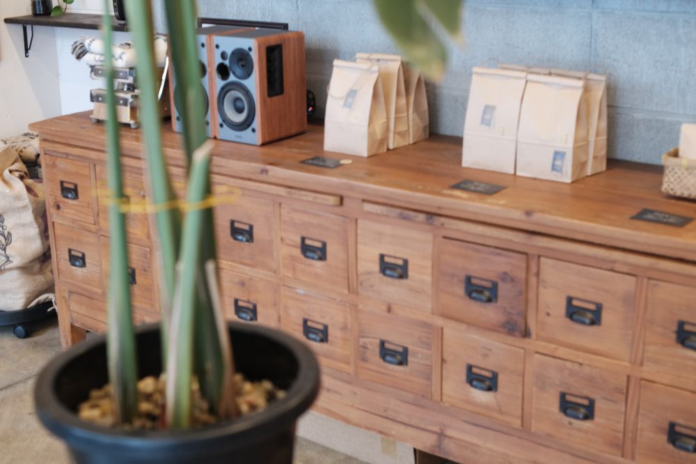 コーヒー豆なんかも販売されてます。この大きなキャビネットが目を引きました。かっこいいですね~。