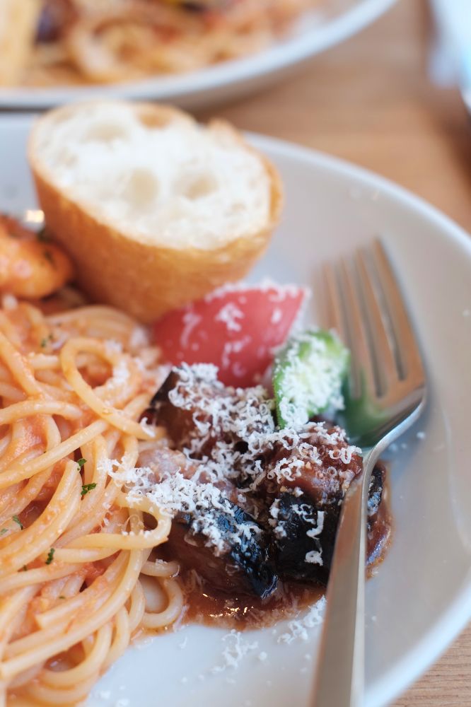 妻が注文したナスのピリ辛ボロネーゼ。ちょっともらいましたが、こっちもやばかったです。