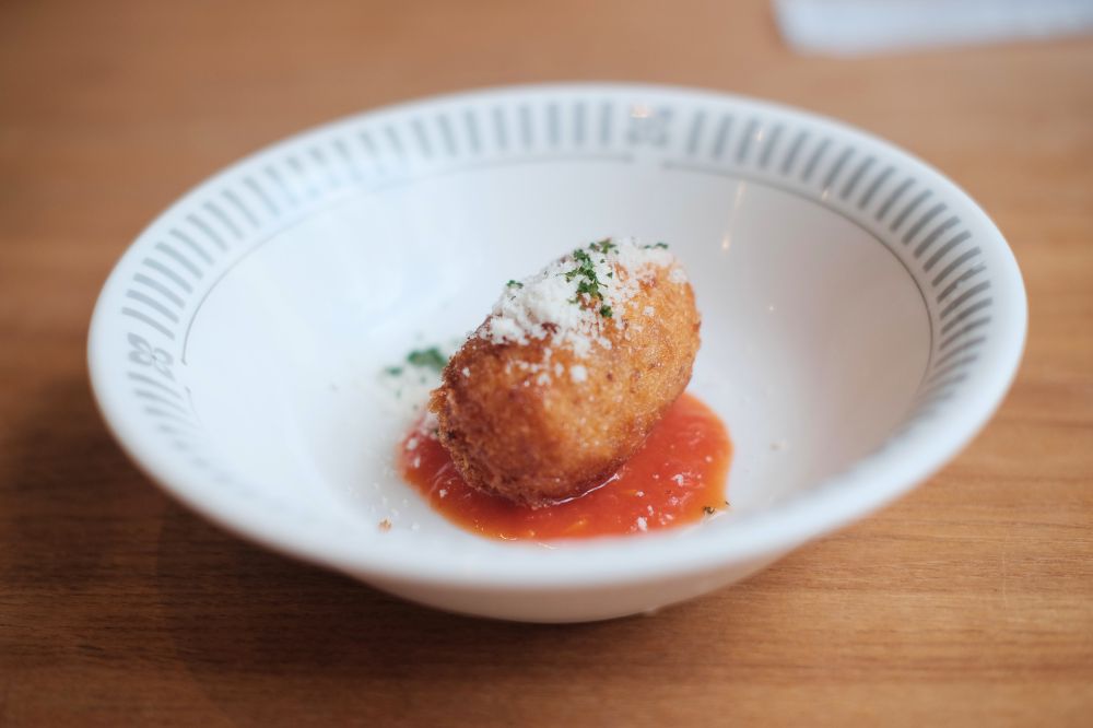 ライスコロッケ。見るからに美味そうですね。パスタ前につまめるこのサイズ感もちょうどいい。カプリチョーザのデカいのも好きですけど、メインの前にあんまりお腹膨らすのもあれかなと。
