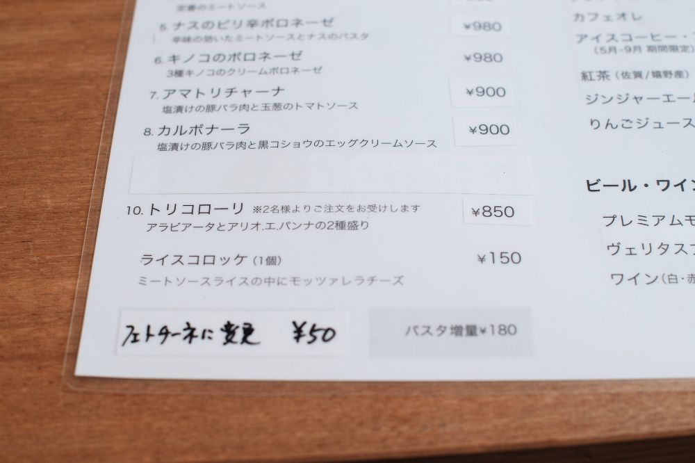 まず値段がヤバいです。パスタって1500円〜2000円くらいのイメージだけど、全て1000円切ってます。安すぎる。。ワンオペだからなのか??