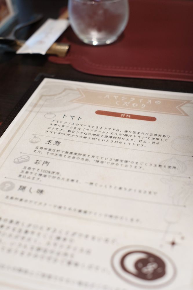 メニュー裏にはお店のこだわりが書いてありました。長崎の五島の食材を多く使われてるみたい。お店の方がそちらの出身とかなのかな?