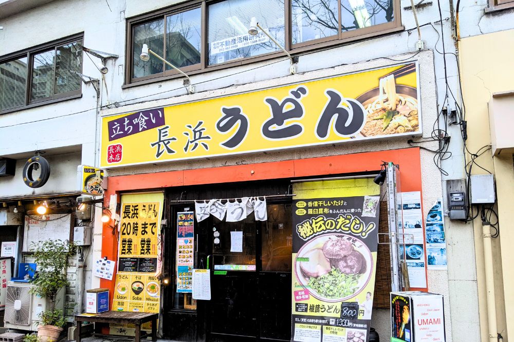 長浜にあるうどん、その名も「長浜うどん」。どストレートなネーミング。寒いし、うどんとかいいな〜ってことで、「長浜うどん」で食べてきました。場所は、那の津通り沿い、浜の町公園の真ん前にあります。駅は赤坂駅が1番近いです。徒歩10分くらいかな。北にまっすぐいって、那の津通りにでたら左に曲がってわりとすぐです。カレー屋さん、居酒屋とかお店が何件か連なってる中に「長浜うどん」もあります。看板には立ち食いって書いてるけど、そうなのか?