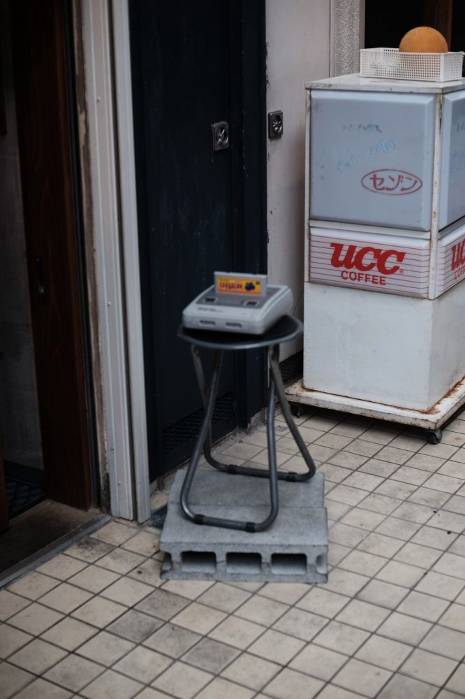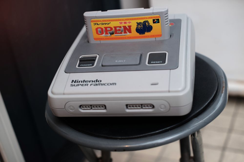 店前にスーファミ本体が。さっきのコントローラーの本体の方。カセットにオリジナルラベルも貼ってて凝ってますね。