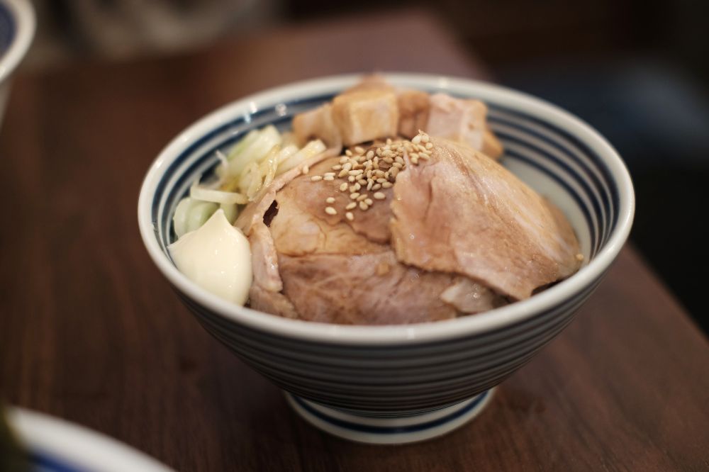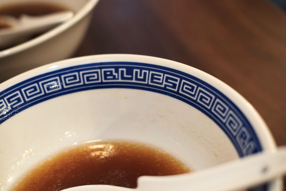 よくみると丼の柄が「BLUES」になってる。ここで一つ謎が解けました。ブルース・リーとは綴りが違う。店名はブルース・リー由来じゃないのかもしれない。「ろくでなしBLUES」や音楽ジャンルの方の綴り。