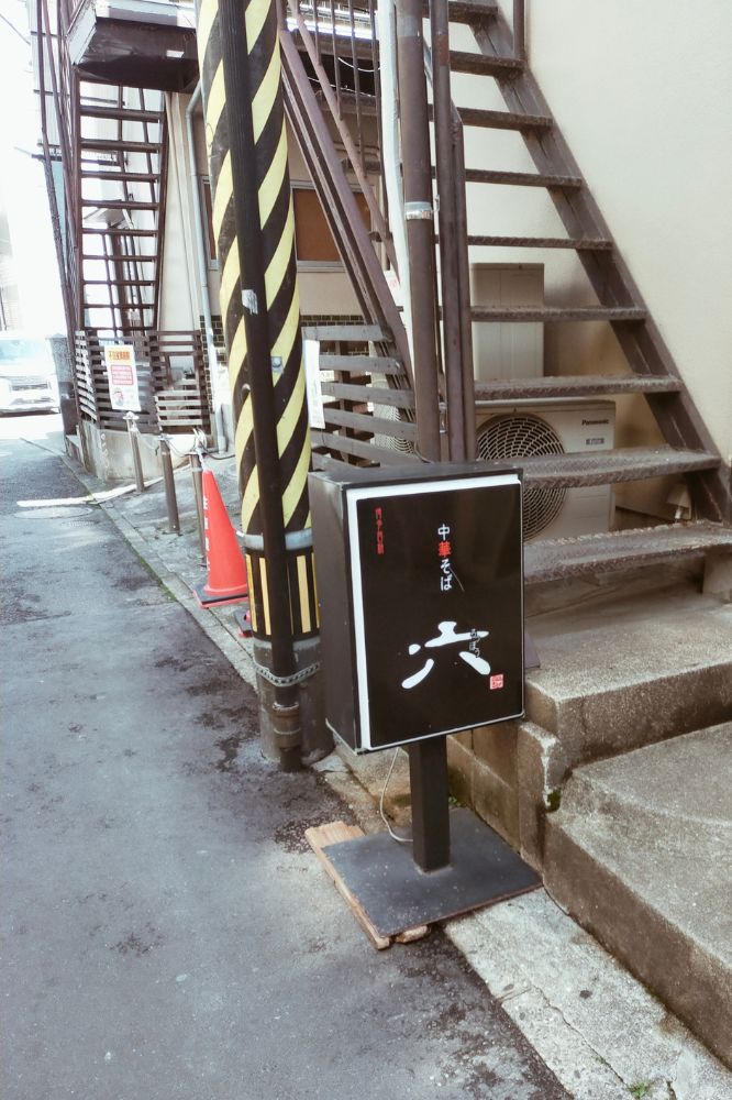 ということでやってきたのは西新のラーメン「六」。一文字で読み方は「ろっぽう」。商店街のメイン通りから一本横に入った、ロジウラベーカリーとかがある辺りにお店があります。