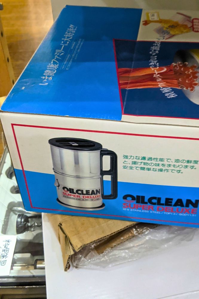 その下に見た目いいオイルポットを発見!日本のものだけど、文字のフォントや色使いが海外製のようなイケてるデザイン。値札がなかったから店員さんに聞いたら880円とのこと。オイルポット探してたこともあり即購入。箱入りのデッドストックでした。こういう何でもない無名メーカーのものにもかっこいいのがあったりするので、リサイクルショップはやめられません。