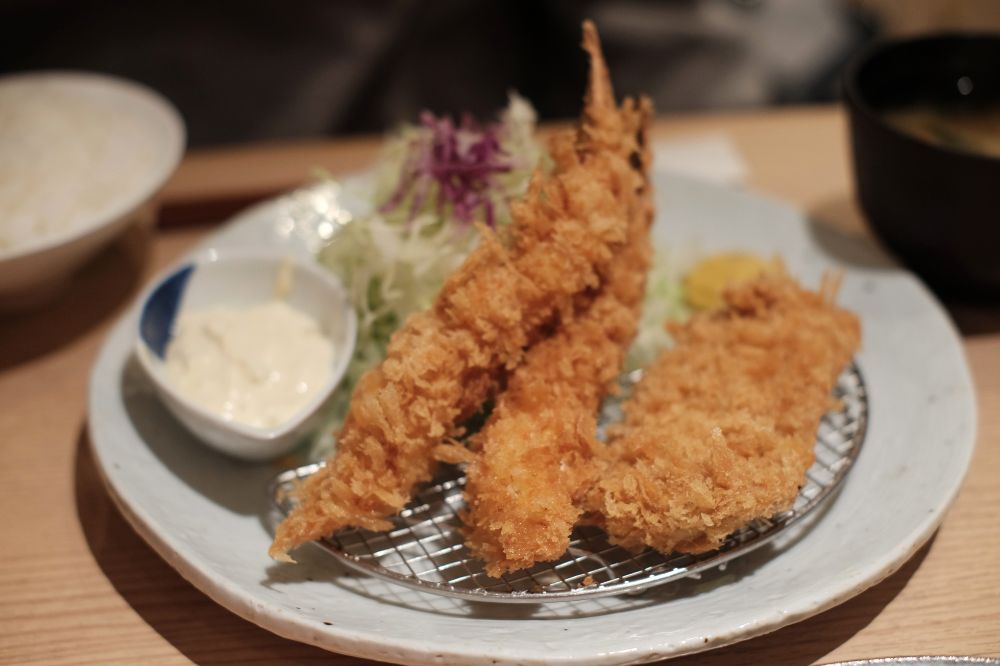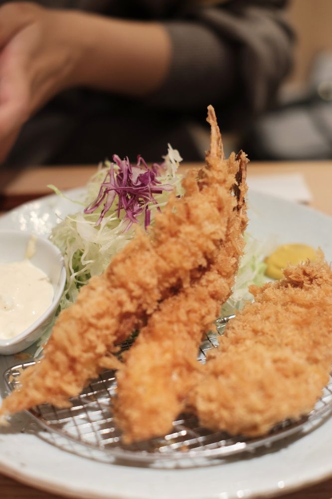妻が注文した「エビフライと一口カツ定食」(たぶん)もちょっともらいました。海老のお尻のギリギリの部分まで殻取ってあって丁寧な仕事。これも間違いないです。