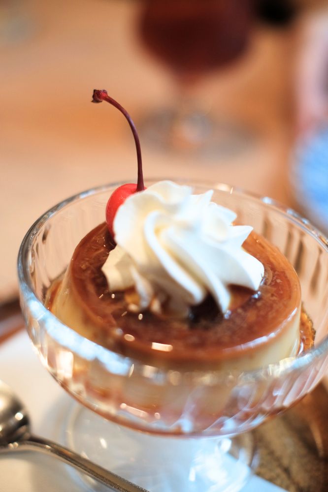 プリンが来ました~。さくらんぼと生クリームが乗っかった「ア・ラ・モード」仕様。一口食べてみると、思った通りの固め食感。最高です。