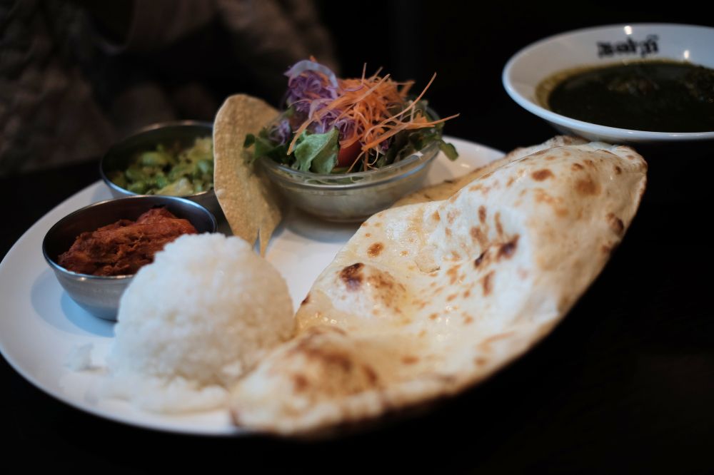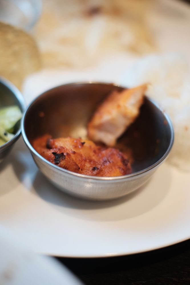 妻のランチセットもきました。こっちはハーフライス、ハーフナンが付いて、あとはサラダやタンドリーチキンなんかも付いてるみたいです。
