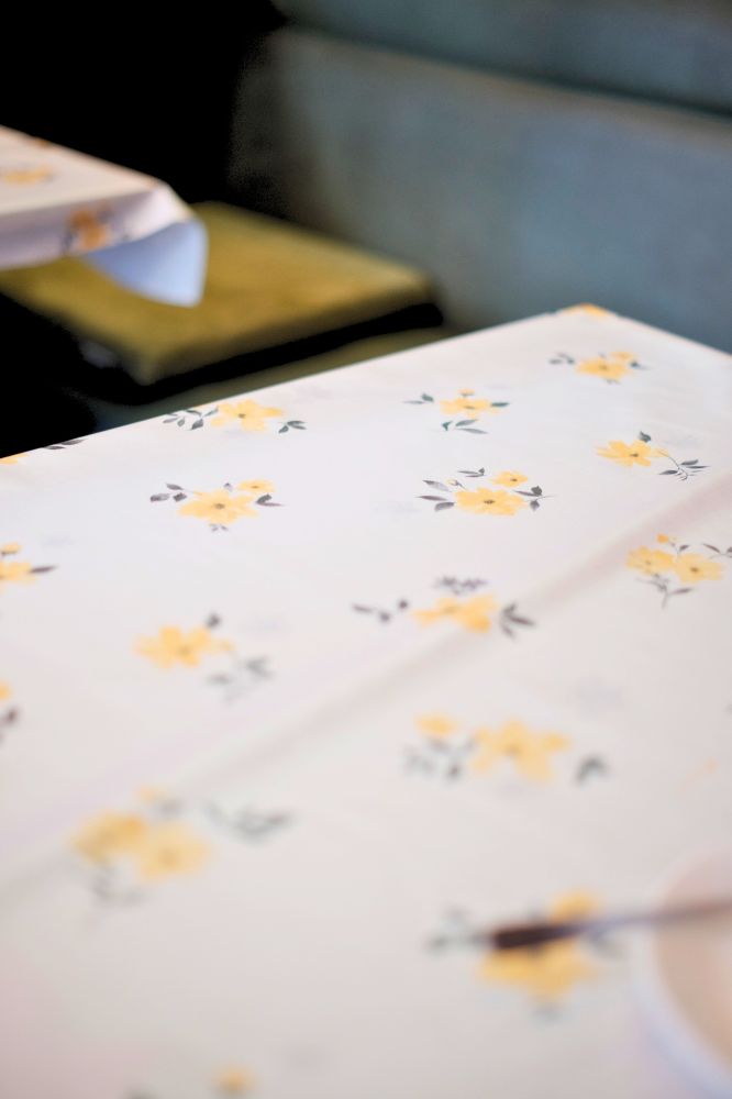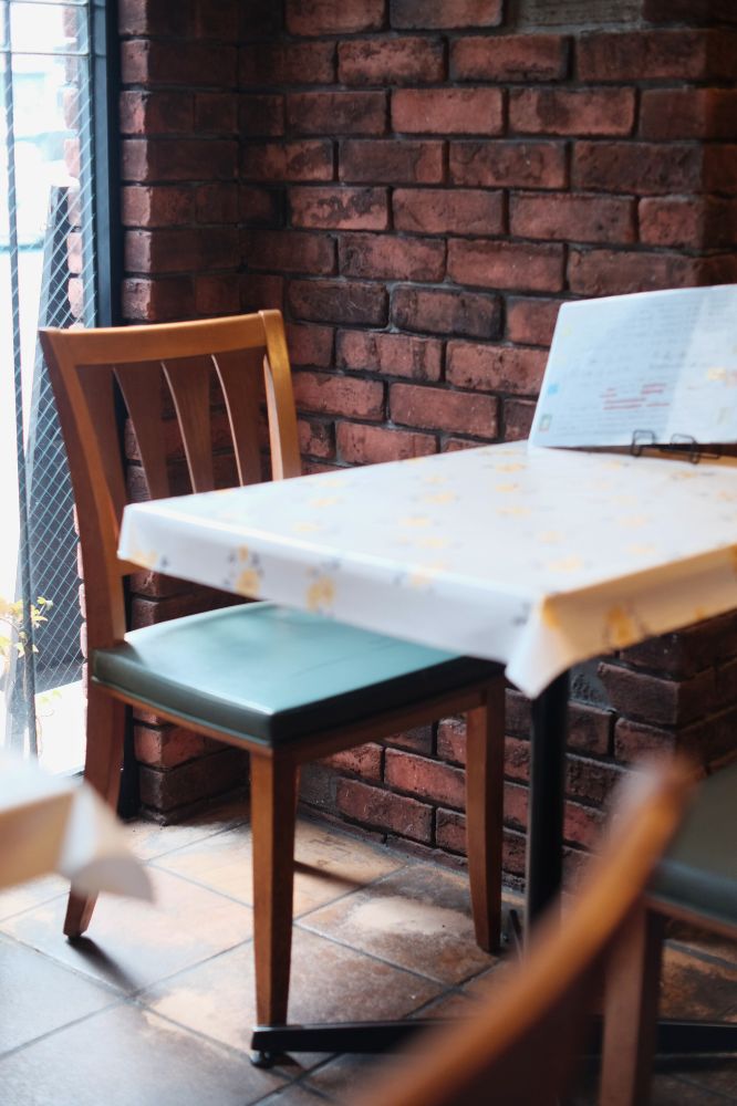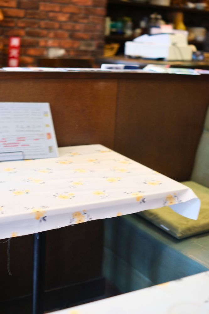 テーブルクロスがかわいい。こういうのは新しいお店にはない味わい。