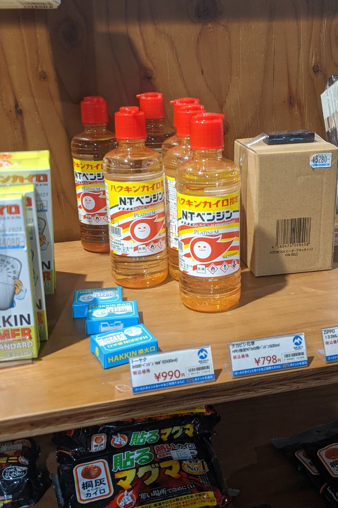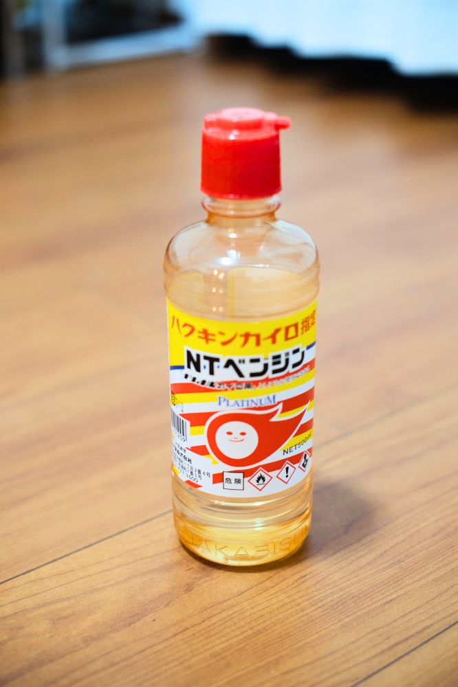 燃料として入れるベンジンも一緒に売ってたので、買います。専用と書いてるけど、他のベンジンだとダメなのかな?ベンジンも昔っぽいパッケージで嫌いじゃない。必要なもの買ったので家帰ります!