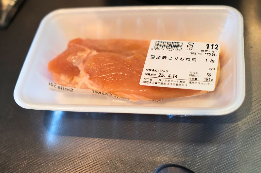 前日に買っておいた、鶏もも肉。適当に買ったので今見ると190gでした。袋には200〜300gの鶏肉って書いてたので大丈夫そう。