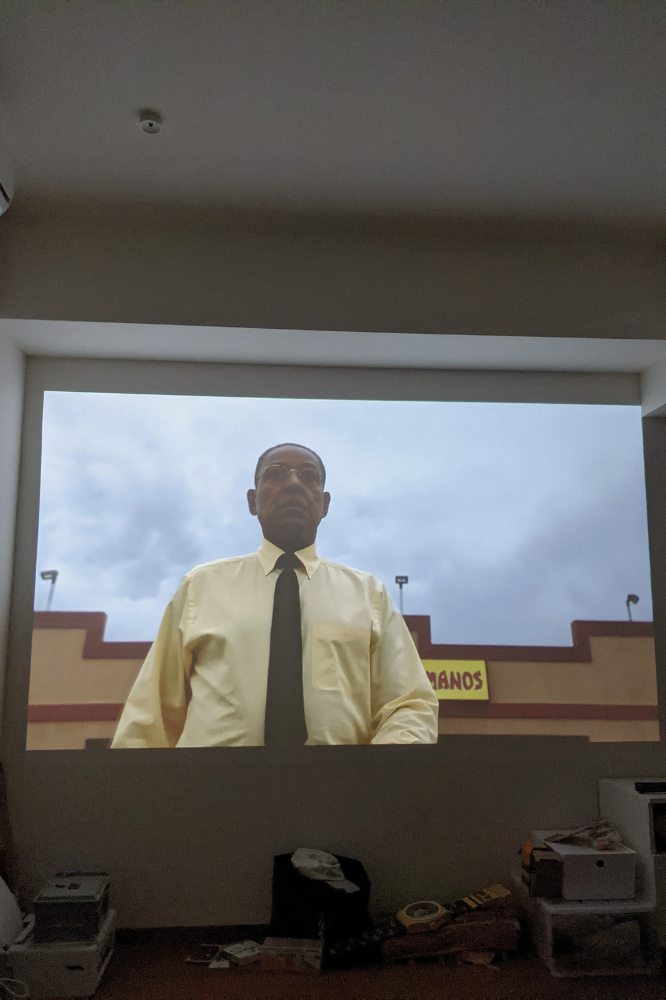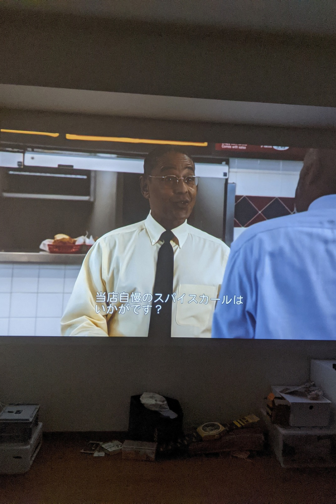 試しにベター・コール・ソウルを流してみるとこんな感じ。サイズは映す壁に応じて変えれます。120インチまでいけるのかな?僕も壁いっぱい使って100インチくらいで写してます。