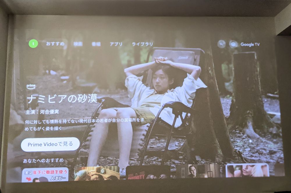 これが夜。キレイに映りました。明暗のコントラストがちゃんと出てますね。画質はまさに映画館のそれ。少しざらついた雰囲気のある画質です。映画やドラマ観るのにピッタリだと思いました。逆にクリアでパキッとした画質が好きであればテレビの方がいいかなと思います。