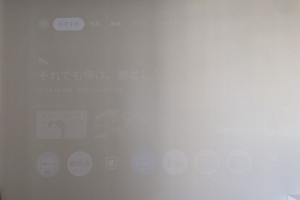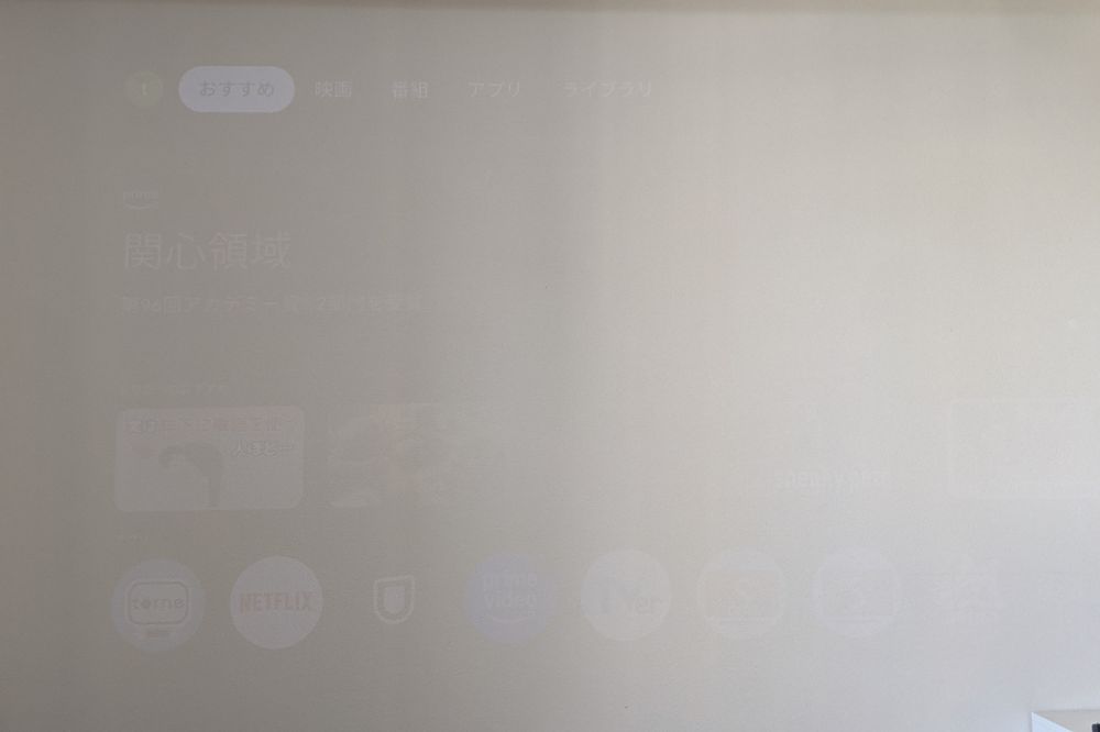 昼間にカーテン開けて電気つけてるとこのくらい。残念ながらほぼ見えない。ここはプロジェクターの最大の弱点ですね。カーテンとかでできるだけ遮光して部屋を暗くしないといけない。