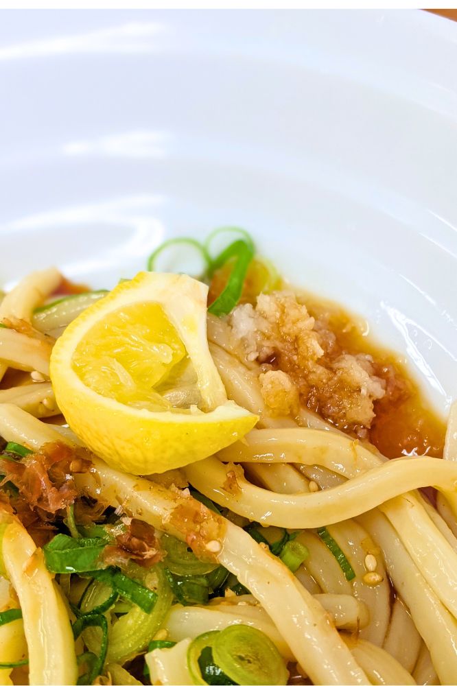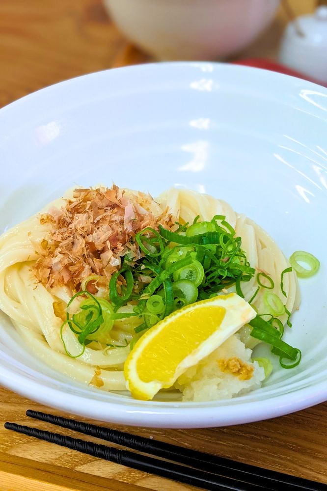 うどんにネギ、大根おろし、かつお節、レモンと王道の薬味で最高です。