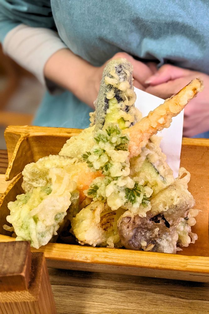 7種のの野菜天。すごいボリューム。大根の天ぷらやカリフラワーの天ぷらなど少し変わり種もあり、おいしかったです。