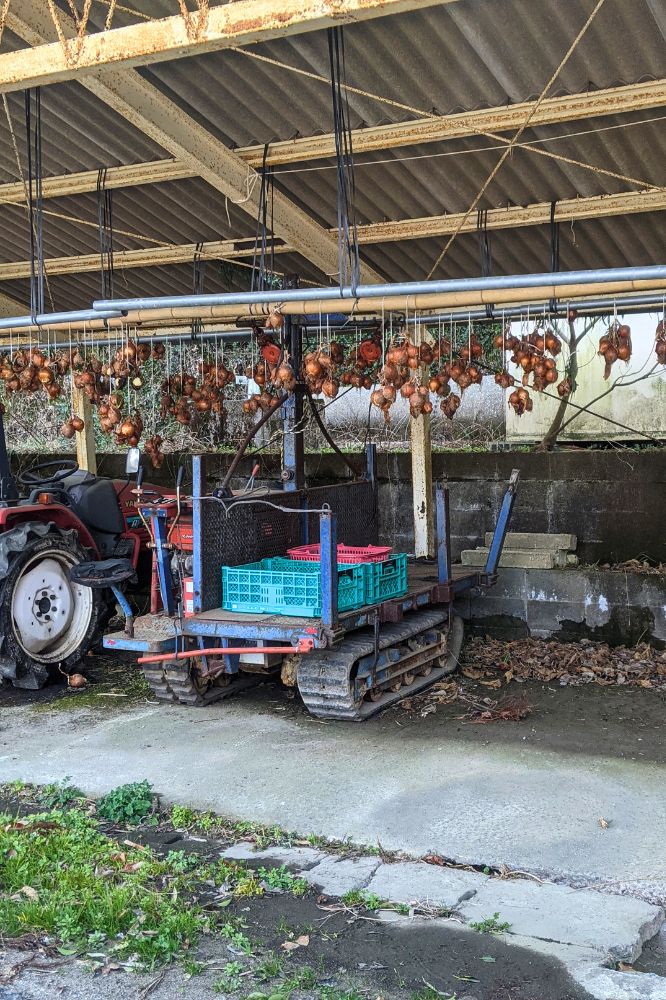 玉ねぎが吊ってある。野菜天に入ってた玉ねぎかな?