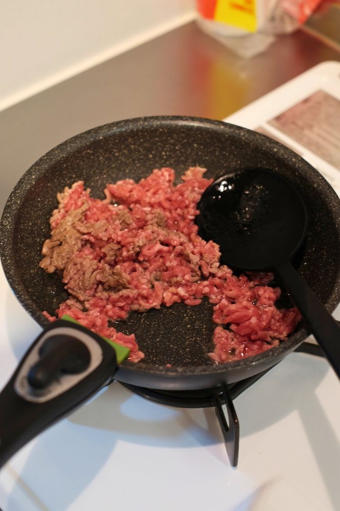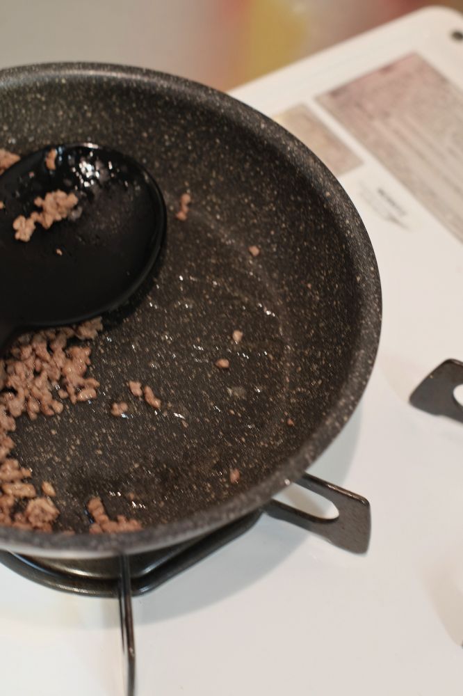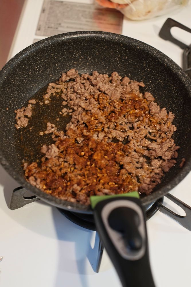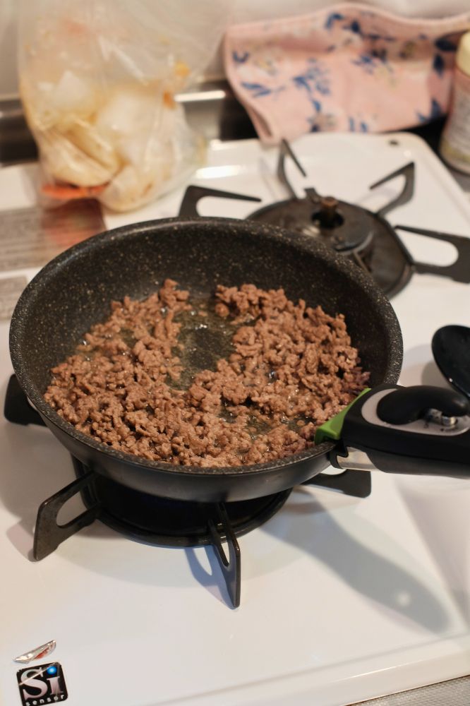 - ひき肉を炒め、余分な脂を切る