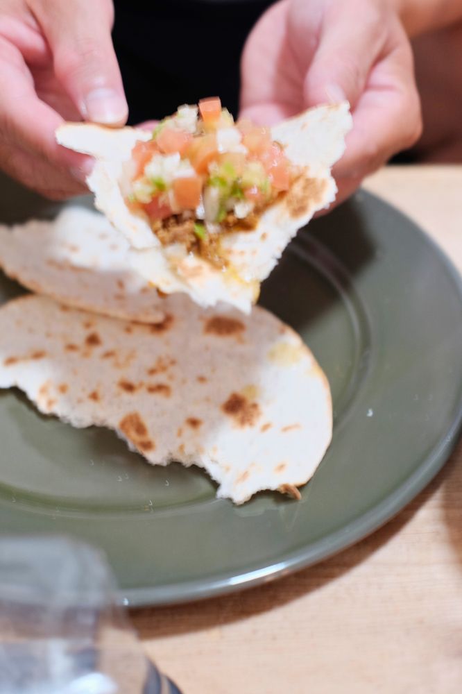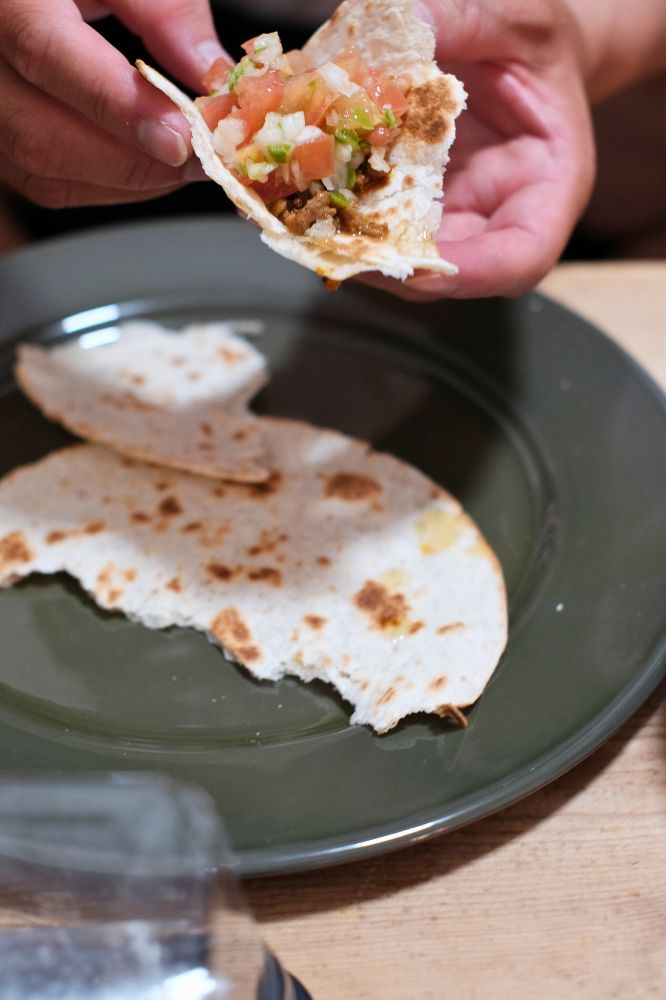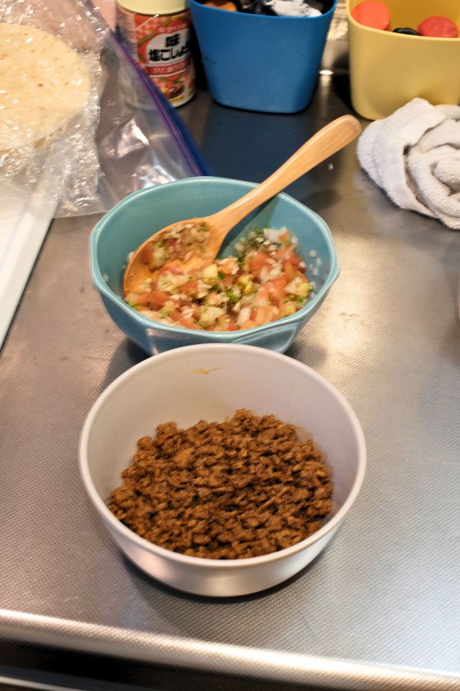 タコミートとサルサソースを多めに作っておけば、ちょっと小腹が空いたときにサクッと1枚焼いて乗っけるだけ。「お昼食べたけど、もうちょい食べたいなー」みたいな時に重宝します。作った分全部食べてしまったのでまた作ろう。