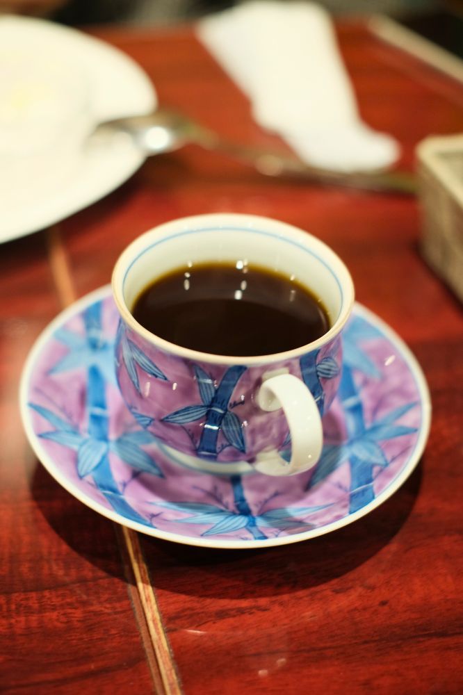朝寒かったからホットコーヒー最高。洋食器なのに柄が和風。