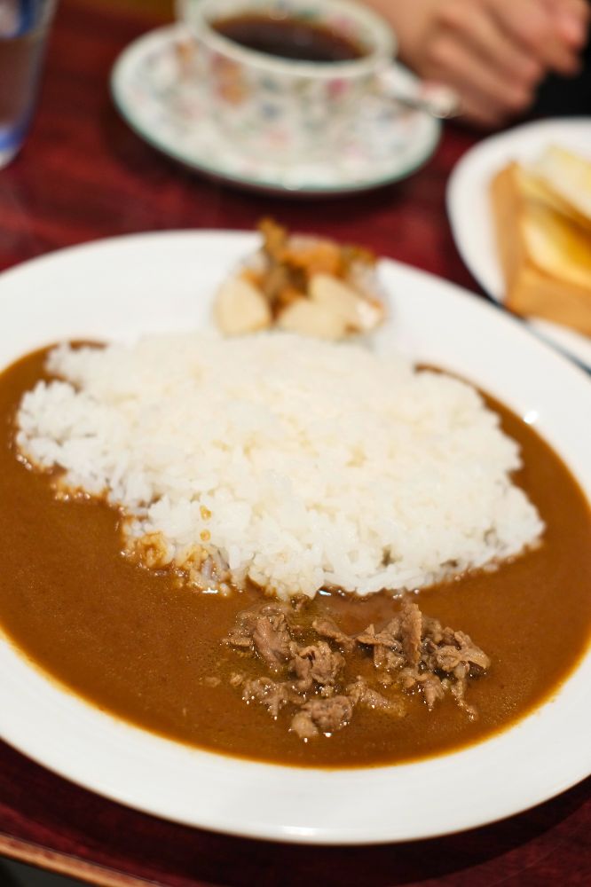 うまいな〜!思ったより辛い。朝からいい雰囲気の純喫茶でカレー食べれる幸せ。お肉少なめがちょうどいいと思った。